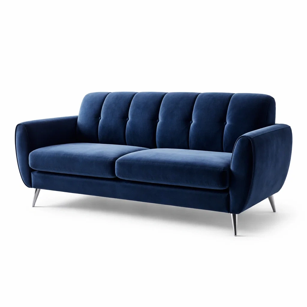Divano a Tre Posti in Velluto Blu con Gambe in Metallo