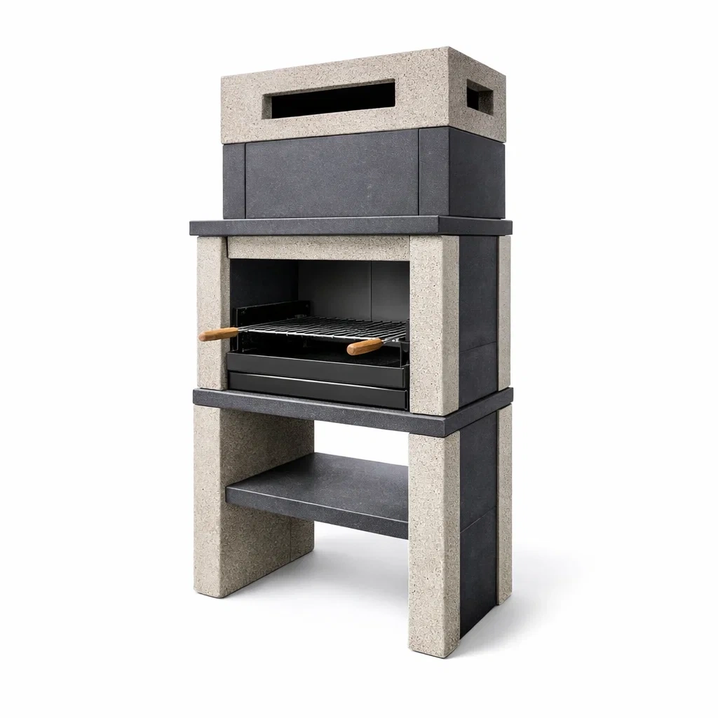 Barbecue prefabbricato con struttura in cemento e calcestruzzo, dotato di griglia in acciaio inox.