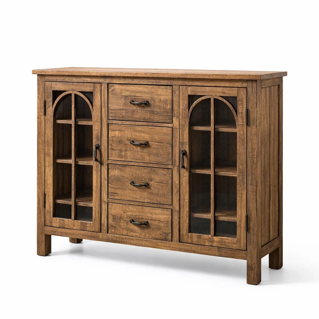 Credenza in Legno Massello con Ante in Vetro Temperato e 4 Cassetti
