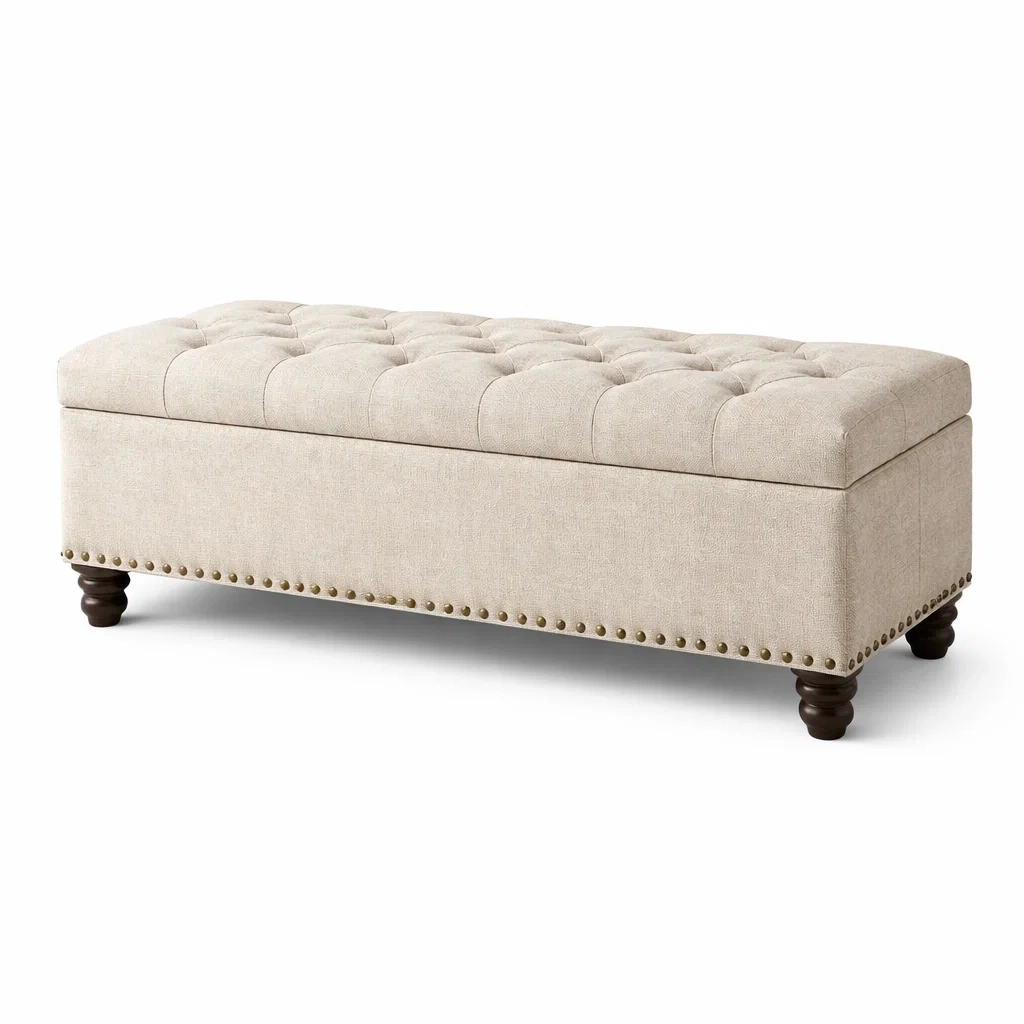 Questa cassapanca è dotata di un rivestimento in tessuto di lino di colore beige, con imbottitura in schiuma poliuretanica per un supporto durevole. Le gambe sono realizzate in legno massello, garantendo stabilità e uno stile classico. Il bordo è completato da borchie decorative, aggiungendo un tocco distintivo. All'interno, offre uno spazio di archiviazione pratico. Dimensioni: Lunghezza 120 cm, Larghezza 45 cm, Altezza 40 cm. Peso: 12.5 kg.