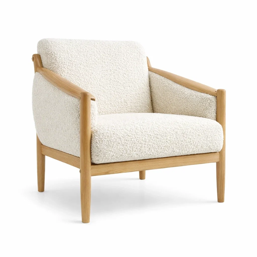 Poltrona in Legno Massello di Rovere con Rivestimento in Bouclé Bianco